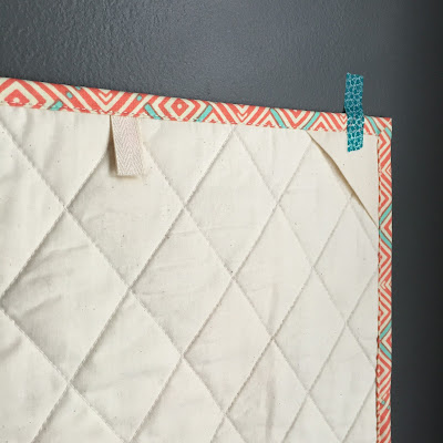 Jayne's recent tutorial to make it hangable. I was super pleased with how quick it was to add corner triangles and twill tape tabs to the back for holding a wooden slat, and I love that it's such a clean finish. I highly recommend