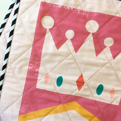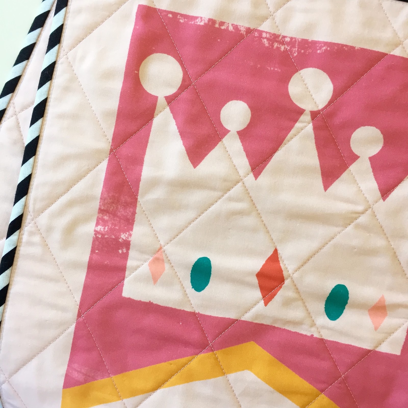 C: Tell us about the stunning Fairy Tale quilt you designed for Salty Oat! What inspired the theme and color choices?TPS: First, we had a blast doing this—it belongs among the projects in question 3! We had decided on a loose fairy tale theme for our baby girl due October 3 (still not here as of the time of this writing), so we took the basic idea of medieval European banners and used them as the basis for the quilt pattern. In the alternating rectangles with images in them, we drew objects that were personally meaningful to us, but also worked well as general heraldic-style symbols—a ship (for This Paper Ship), the fleur-de-lis of Florence (one of her middle names, where we honeymooned), a bird (inspired from a vintage wall decoration from Ashley's grandma's house), etc. For the colors, we wanted to go bright and make the design work for both boys and girls; we were inspired by Disney's immaculate Sleeping Beauty and their vibrant treatment of color in a Middle Ages setting.