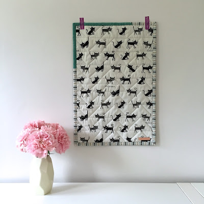 I used a puffier-than-normal batting that gives the mini quilt a nice loft, which was especially apparent after I stitched in the ditch; the geese really appear to pop! I used a whimsical, long-hoarded Japanese cat print for the back, which happened to coordinate with the quilt's color palette.