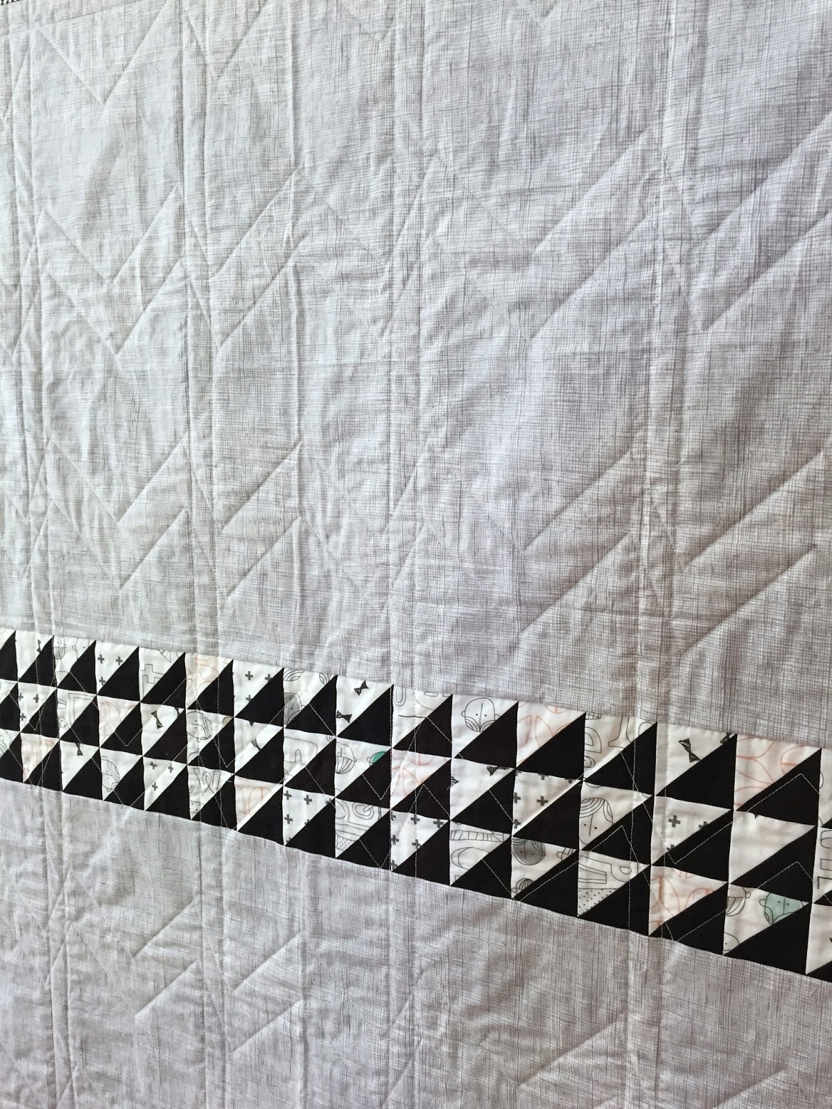 The construction of the arrow blocks results in leftover half-square triangles, which I in turn sewed into a row, and set amidst a light gray cross-hatch print on the back, which shows off the zig-zag quilting beautifully.