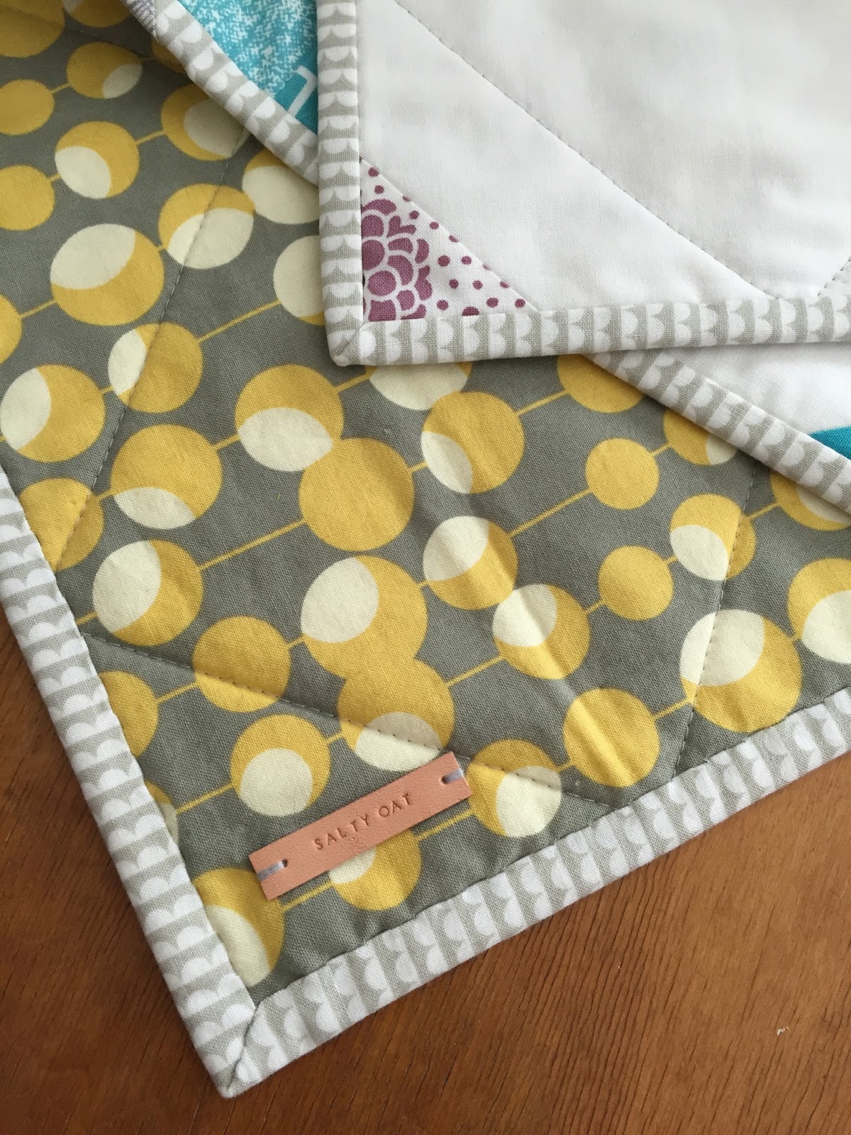 Continuing with the backing's color scheme, I quilted a large grid in gray thread, and made a gray, scrappy binding from some favorite prints.