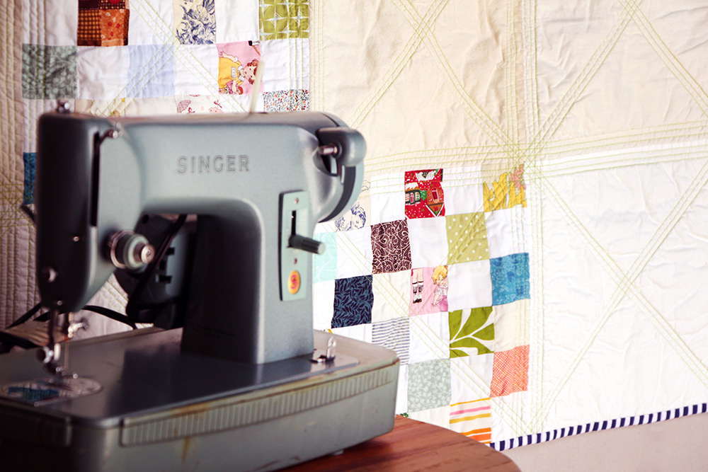 I backed the top with a Marimekko large lime green dot, and quilted it with intersecting straight lines in a matching bright green thread. The binding is a navy-and-white stripe from Sew Modern.