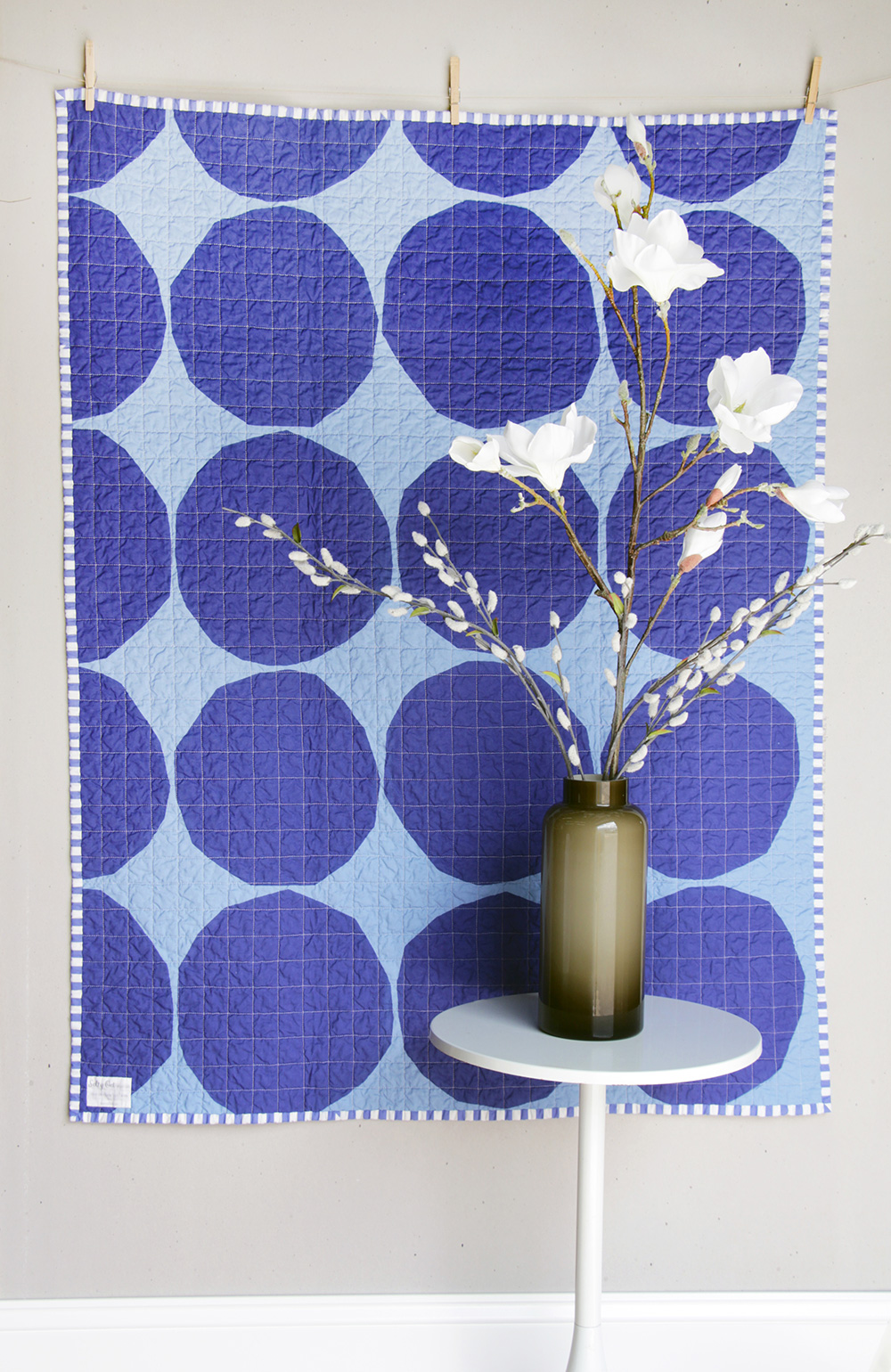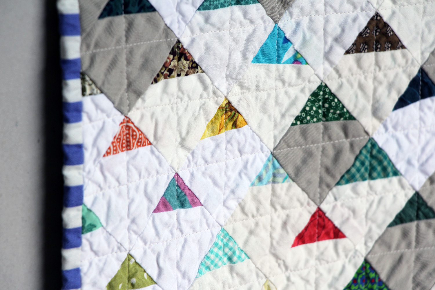 I used a saturated and bold blue Marimekko print for the back and a coordinating cobalt-blue-and-white stripe for the binding. I stuck with my favorite cross-hatch quilting, which added a nice texture to the quilt.