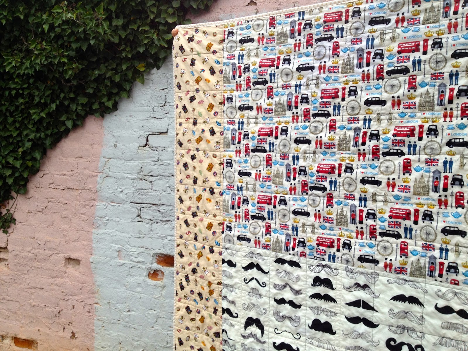 churn dash blocks, using solid black and low-volume prints. Six months later, and during my short holiday break, I finally managed to quilt and bind our quilt---my first finish of 2014!