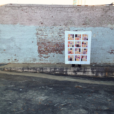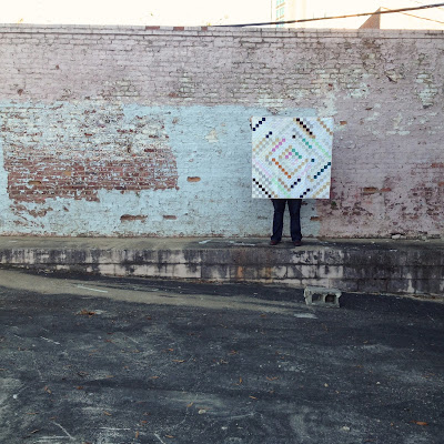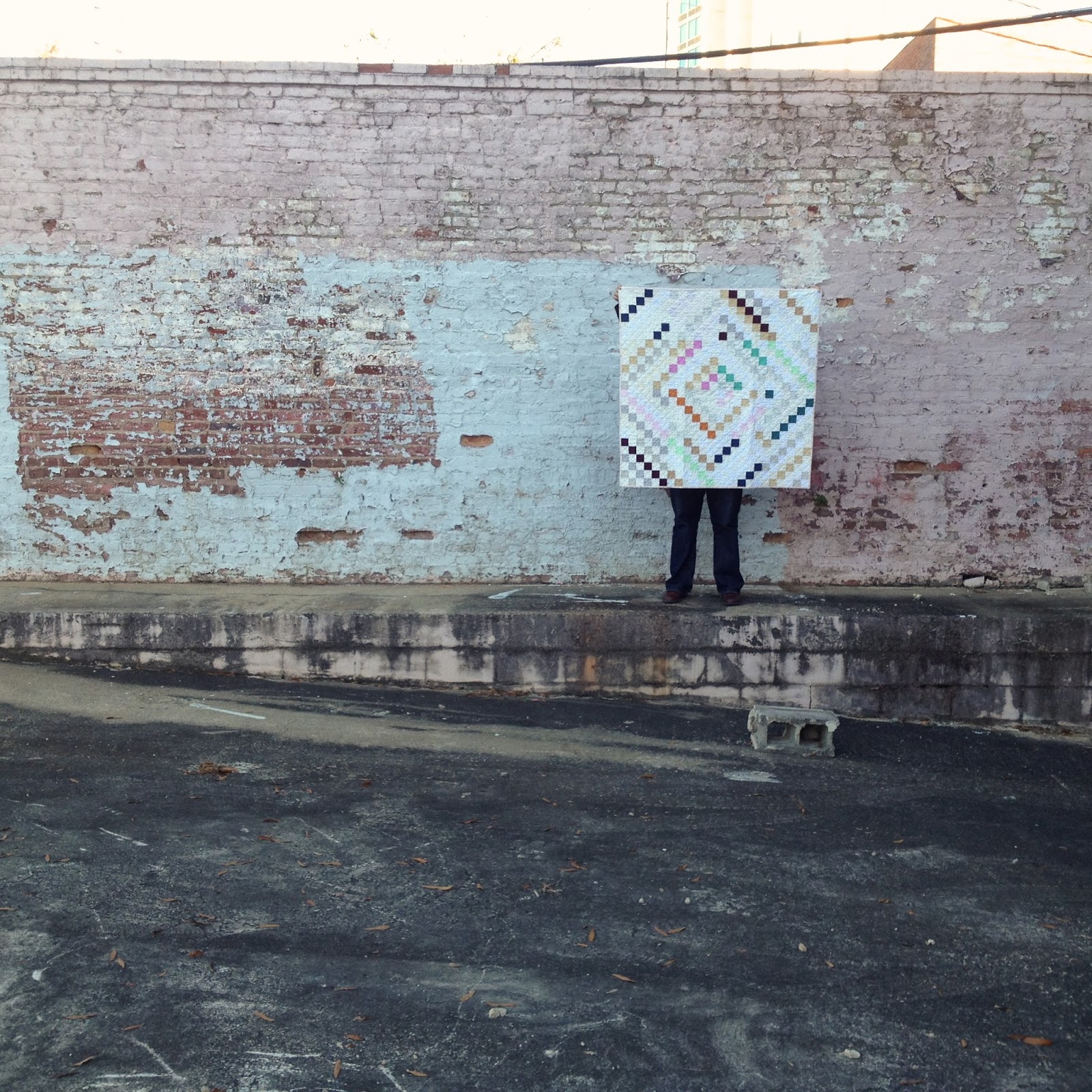This past weekend, my husband and I drove around looking for a place to photograph two of my recent finishes. We wound up at this pink brick wall in downtown Raleigh, and were actually soon joined by a photographer and a family, who were looking to use the wall as a backdrop as well (they awkwardly stood behind me as I snapped my last few pictures). First up was a low-volume Scrappy Trip Around the World quilt I made from solid and almost-solid cottons and linens. I stuck with a low-volume theme, throwing in strips of color here and there.