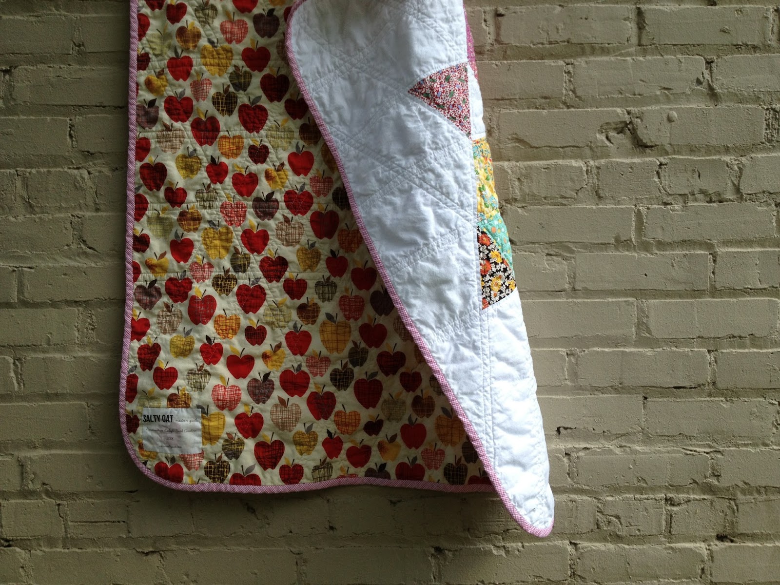 I backed it with an apple print by Alexander Henry and quilted it with straight lines that follow the angles of the triangles' sides. Inspired by