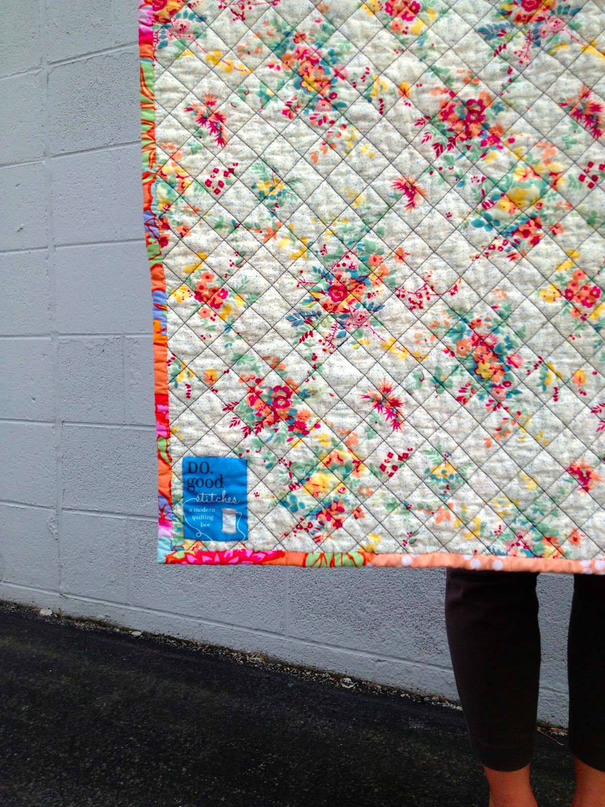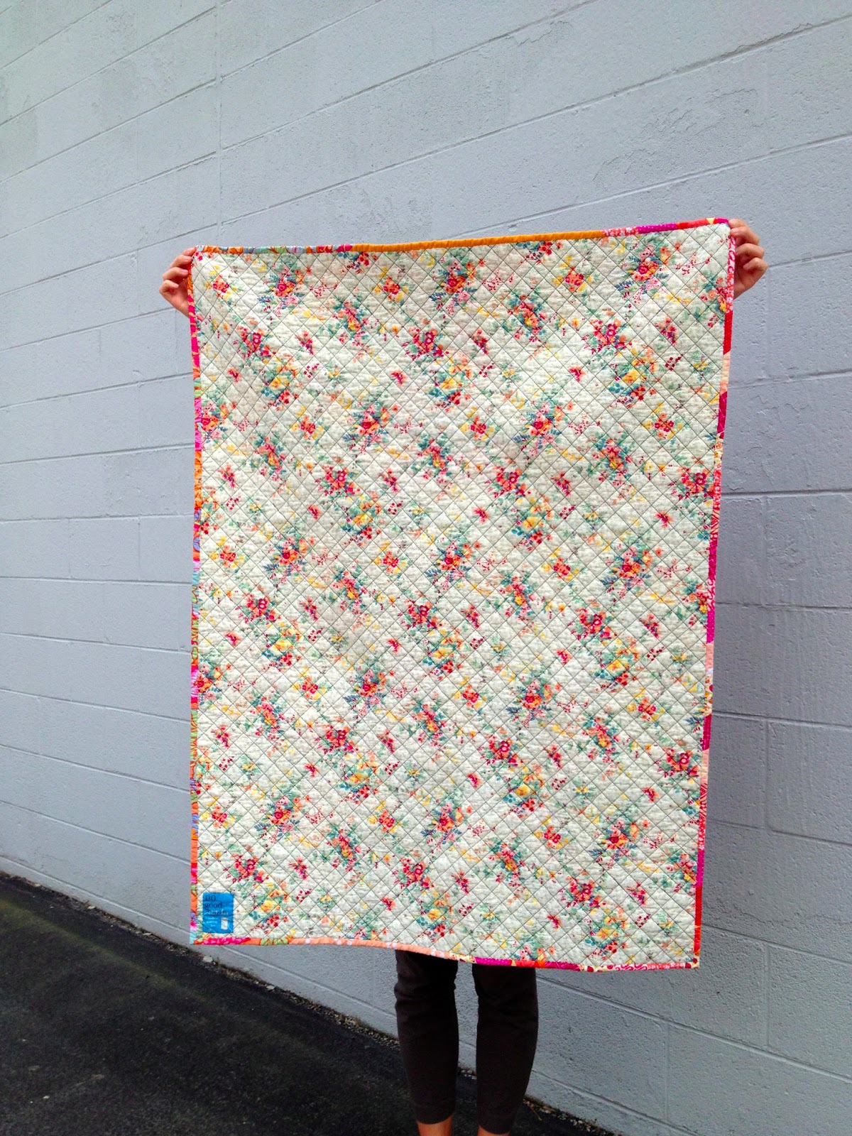 I fell in love with every block that was sent, and assembled them into this baby quilt, which I quilted with an imperfect, one-inch grid. For the backing, I used a well-coordinated floral print that I picked up from the $2.97/yard table at the fabric store I worked at a few years ago. The binding is scrappy and bright.