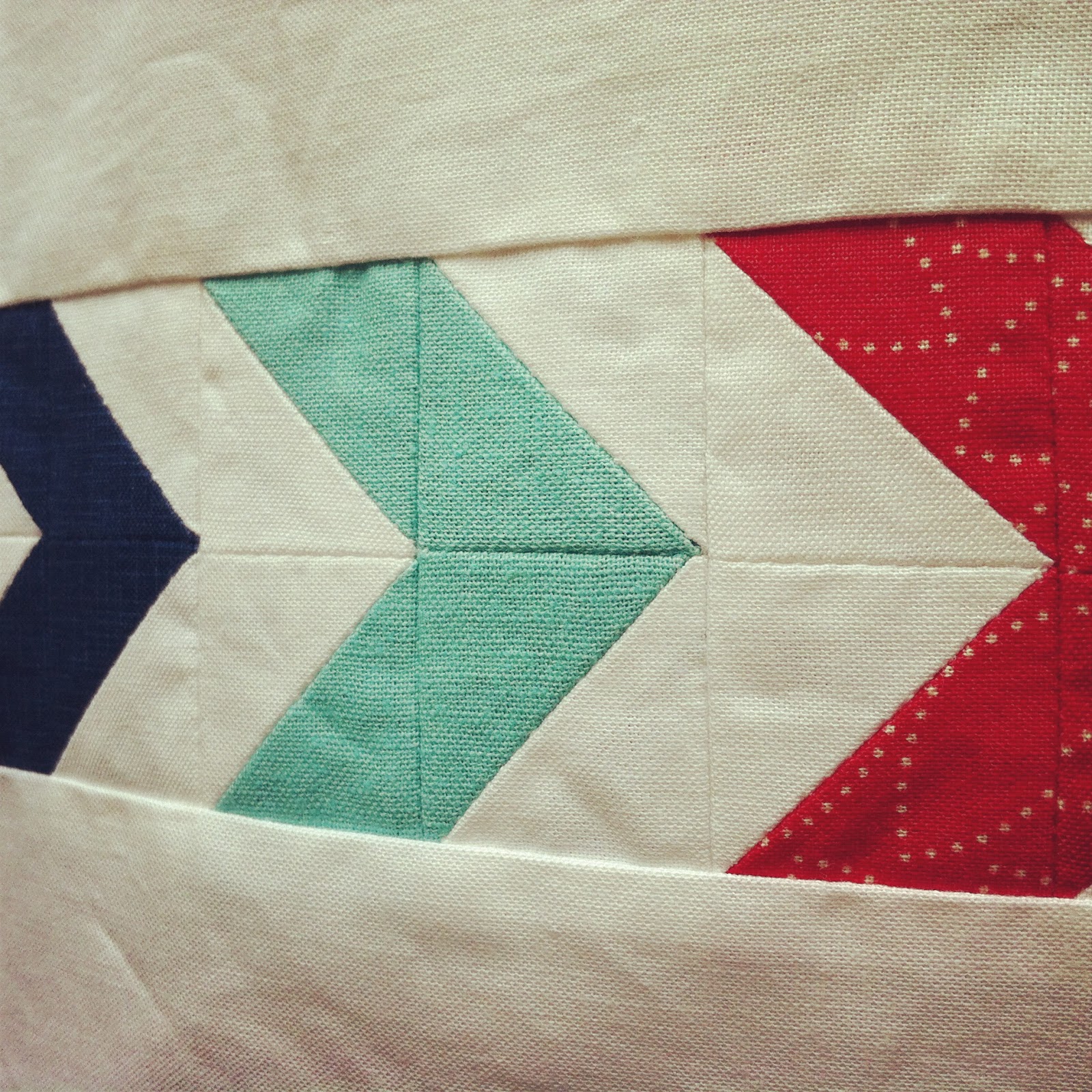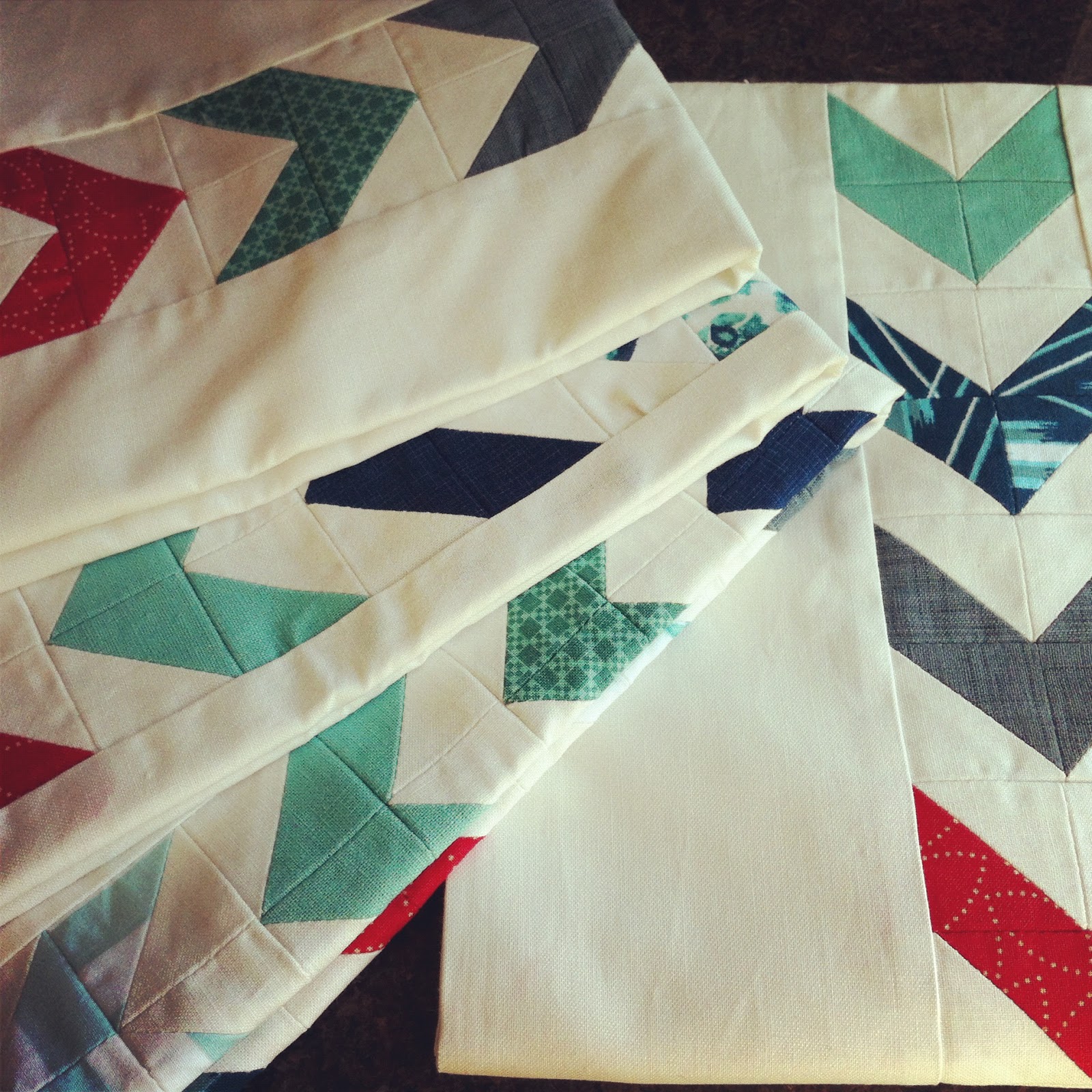 I wanted the napkins to be modern and simple, so I decided to incorporate the ubiquitous chevron, along with a lot of negative space. I created the chevrons from half-square triangles, and then pieced them into columns that ran the width of the napkin. Each napkin features all of the fabrics from the bundle, arranged in a random order.