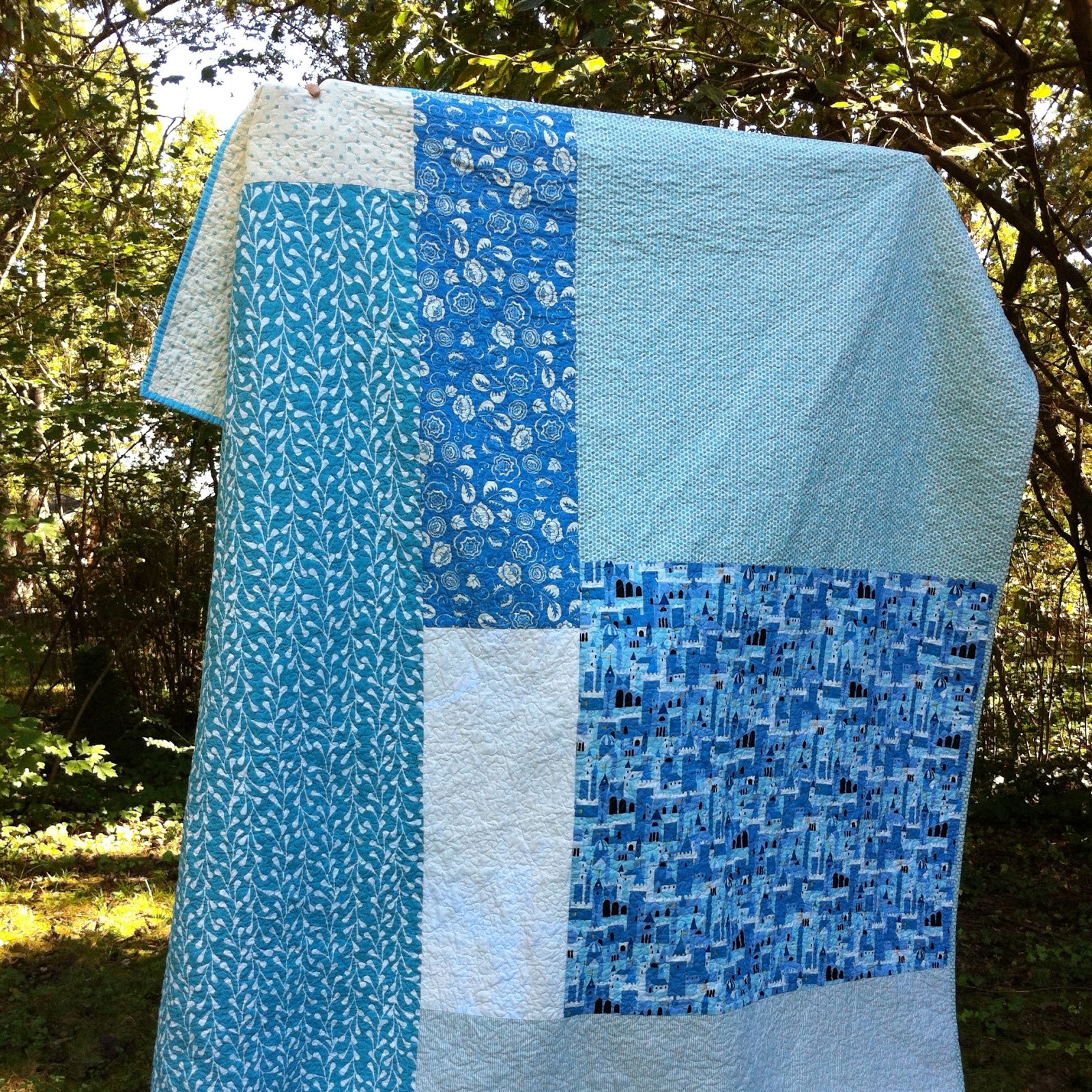 To make it, I paired almost all of the light blue prints in my stash (ranging from vintage to new) with solid white---I love how well the various prints work with one another, despite differences in scale and value.