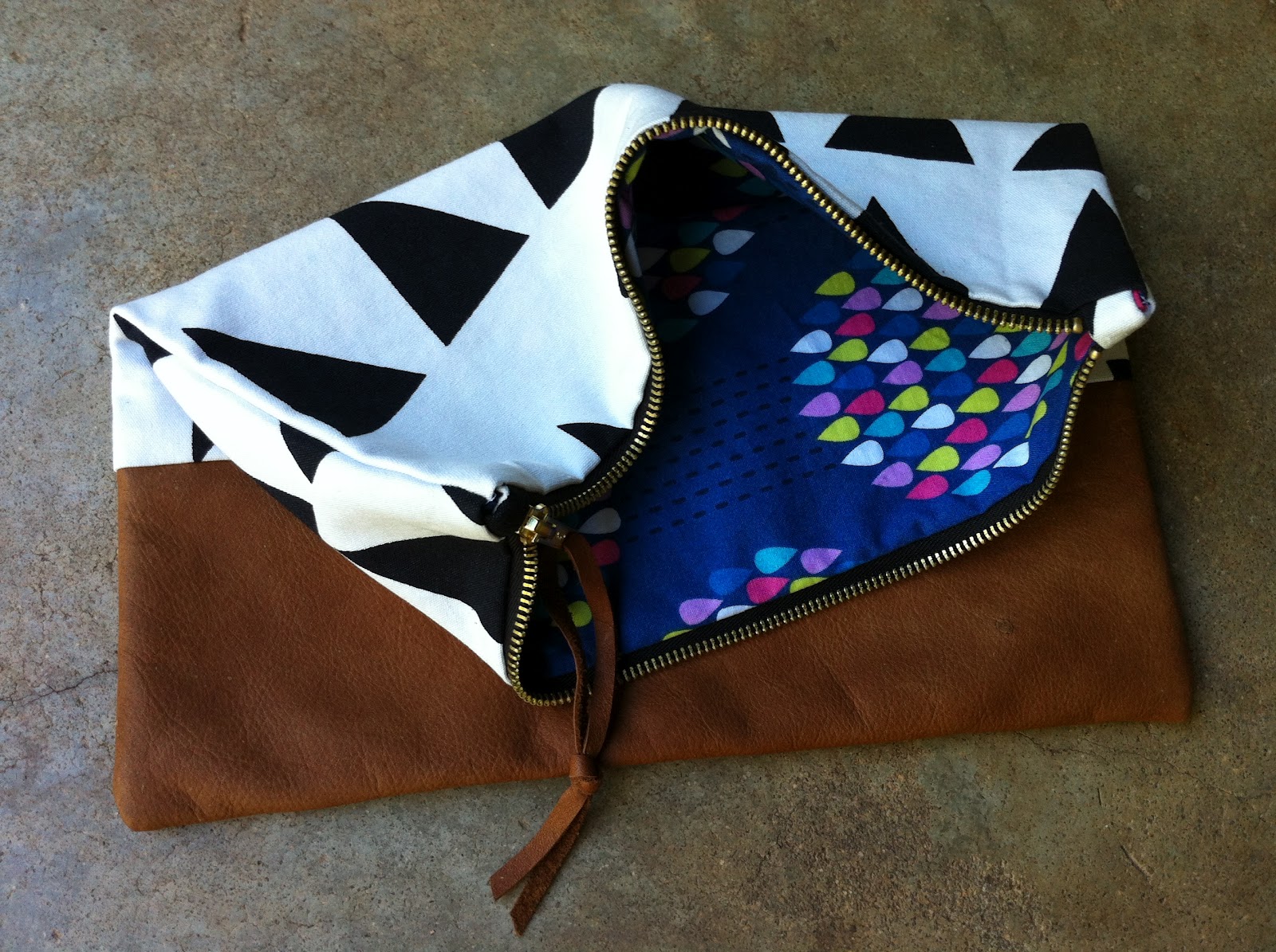 Thanks to an afternoon sewing session with a friend, I managed to start and finish the clutch in a day. I used black and white fabric from Ikea (look familiar?) and leather from another friend for the outside of the clutch.