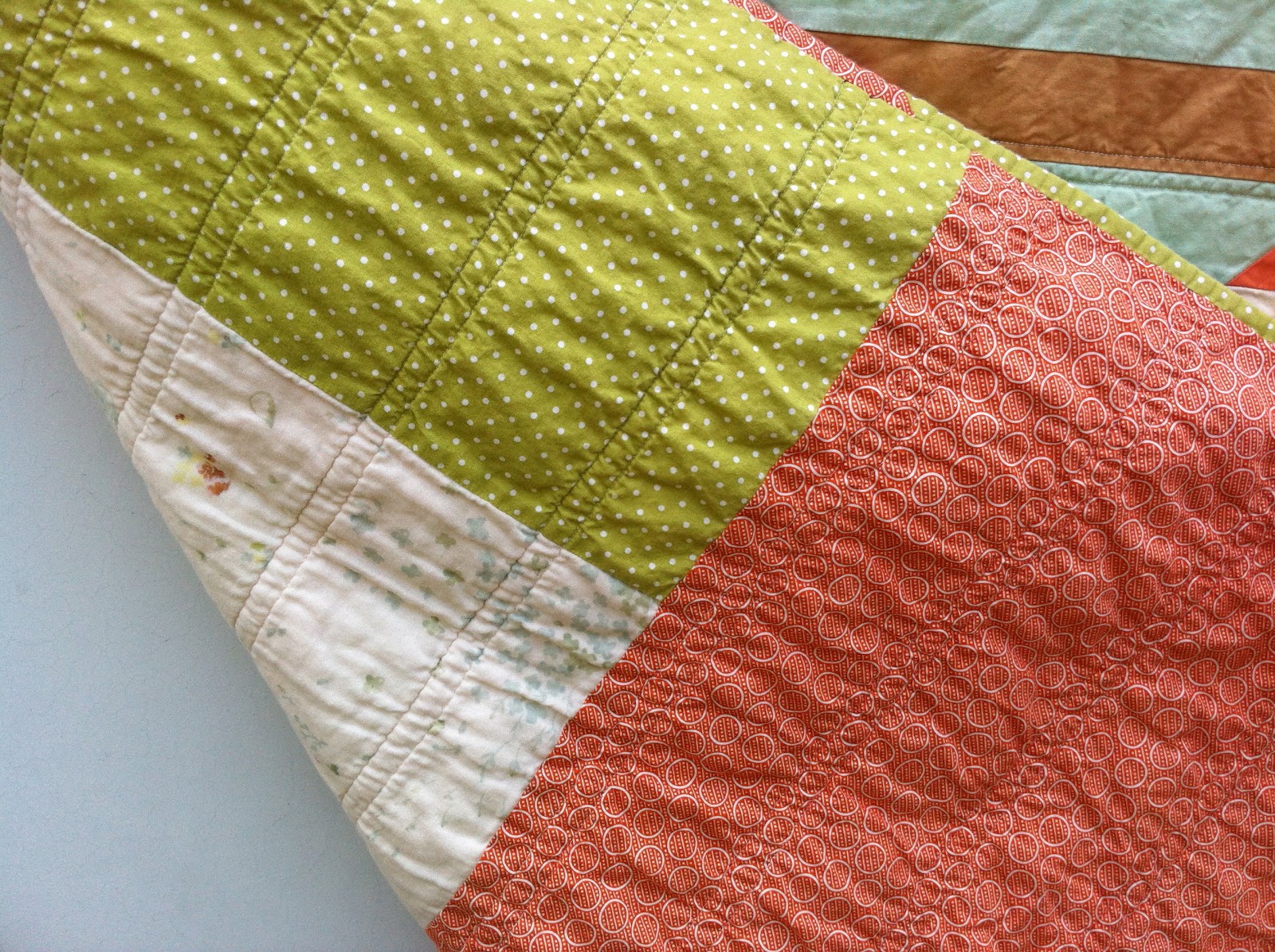 Nani Iro double gauze (so soft and pretty and perfect for the back of a quilt, though a bit fussy to work with!) and paired it with two simple prints, including one by Denyse Schmidt. Thanks to the double gauze, the quilt turned out super cuddly.