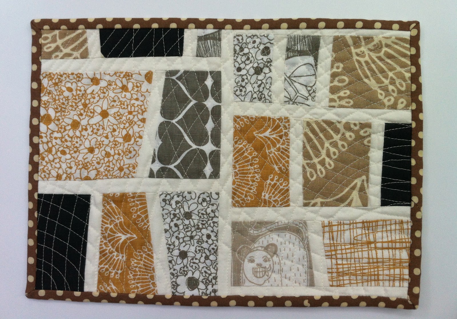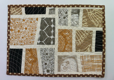 After the rush of getting ready for this month's craft fair was over, I finally had a chance to sit down and work on my entry for the Umbrella Prints Trimmings Competition. [Umbrella Prints is an Australian textile house, specializing in hand-printed fabrics.] After staring at the neutral scraps I was sent (pictured above), and rejecting a number of ideas, I finally decided to try out Elizabeth Hartman's Mod Mosaic tutorial, a technique that I'd been interested in, and one that my swap partner Valerie used when she made me a pillow last summer.