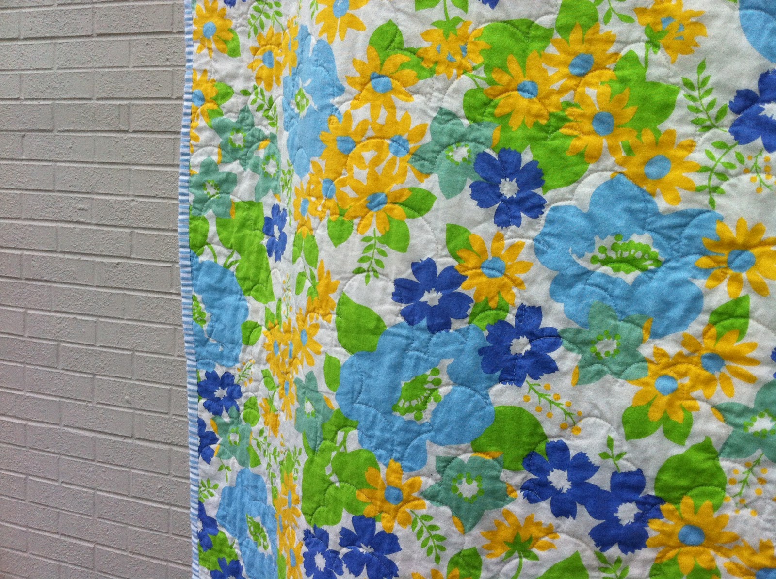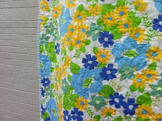 I asked Joanne to quilt it with a cloud pattern, and I am so, so happy with the results. I backed the top with a vintage sheet-inspired print from Urban Chik's Dream On collection and bound the quilt with a blue and white stripe. This was the first stripy binding I've done, and it definitely won't be my last---I love how it looks!