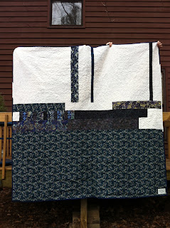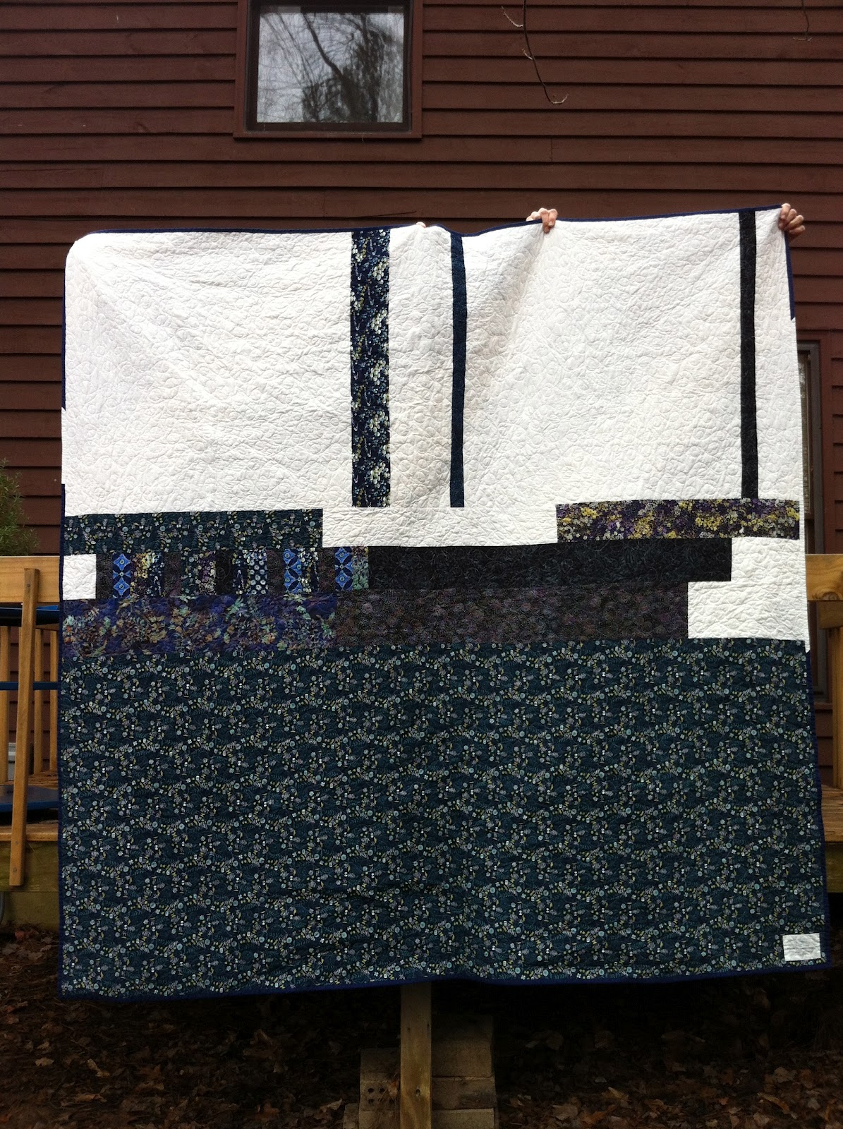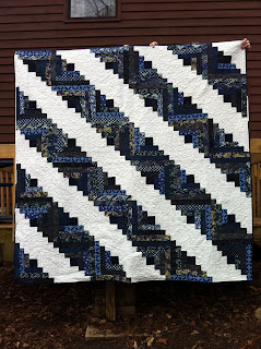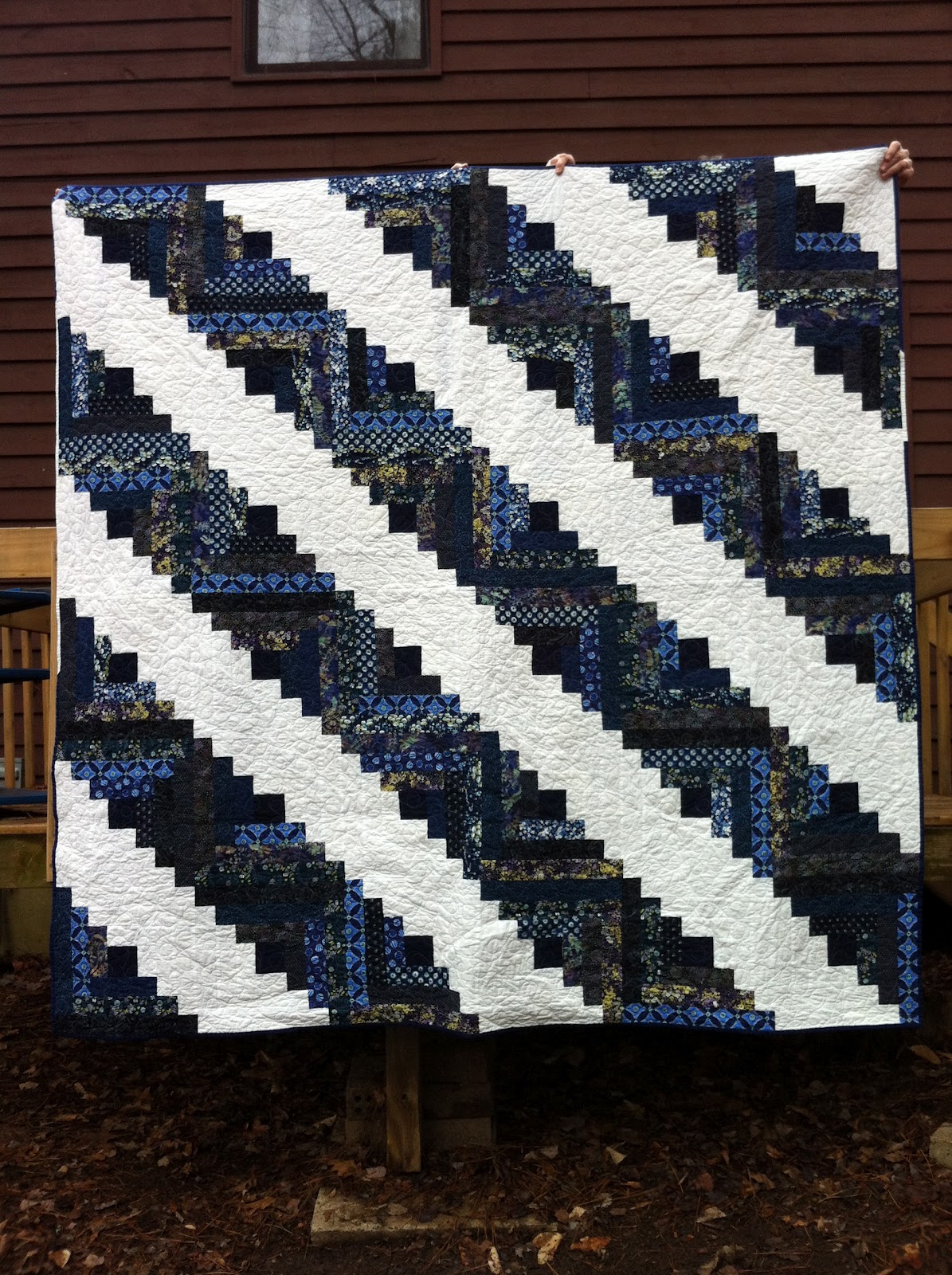 In January, right before my parents arrived for a visit, I managed to finish their Christmas gift: a queen-size log cabin quilt made from navy prints and solid white.