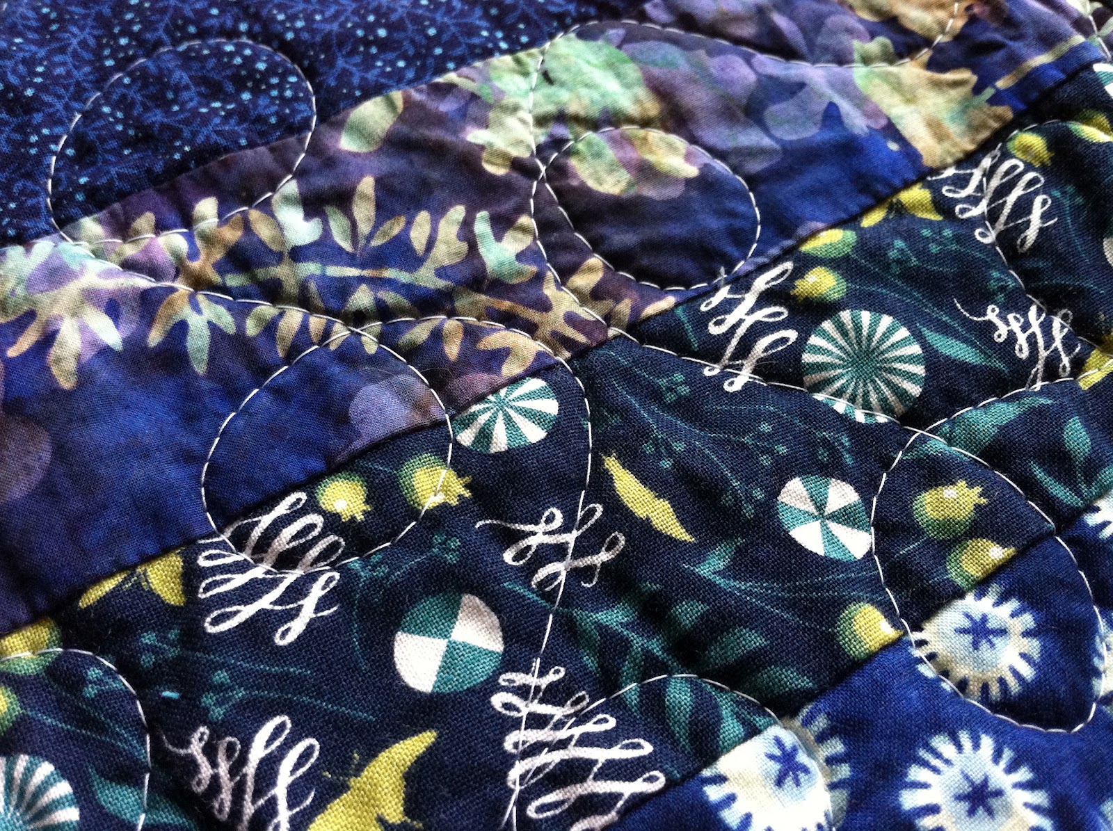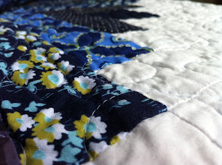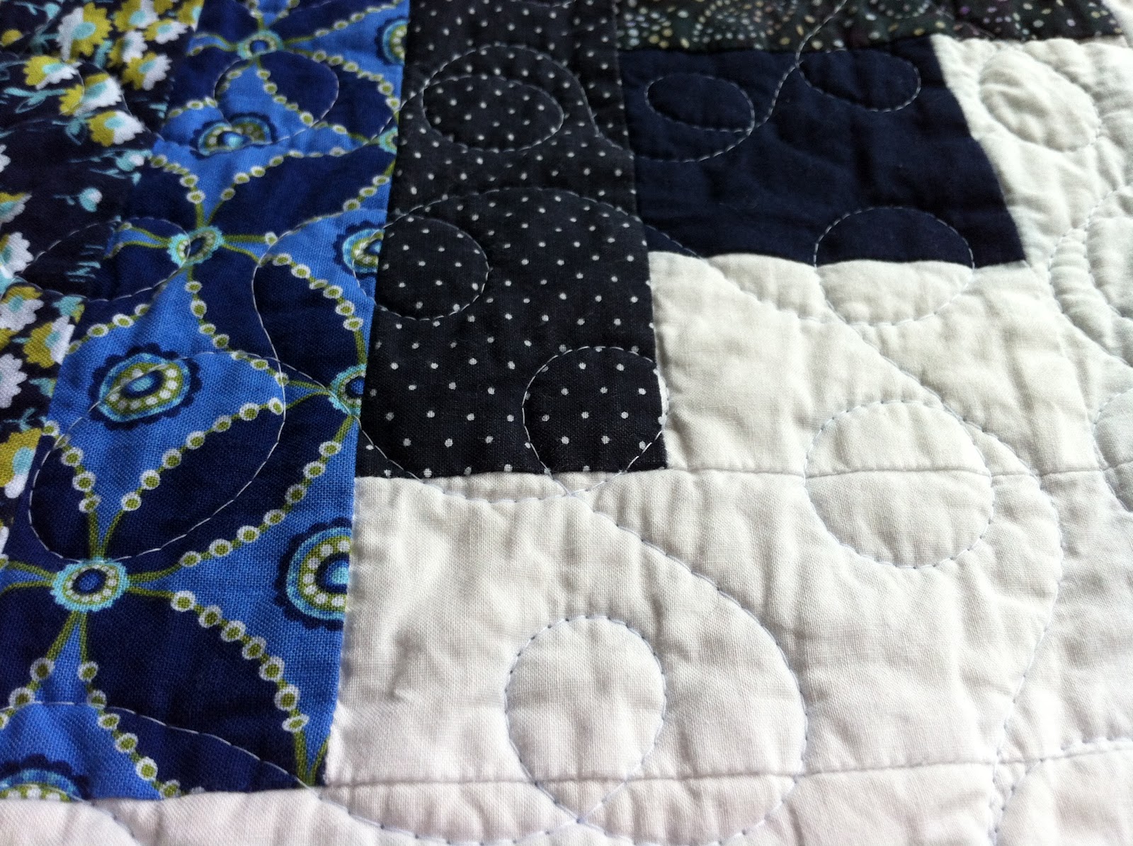 I sent it off to Joanne, who beautifully quilted it with loops, and then bound it with solid navy (and a little bit of white) when it returned. It's the largest quilt I've made to date, and I'm so, so happy with how it turned out.