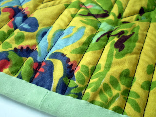 I opted to use all solid scraps on the front, and a floral thrift-store print on the back. This literally took me three hours to make (that included picking fabric, piecing, and hand-sewing the binding), which made it such a fun and satisfying project.