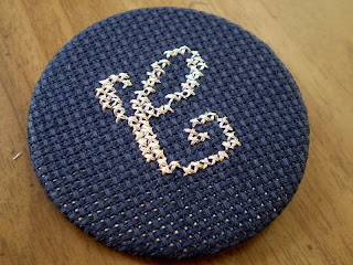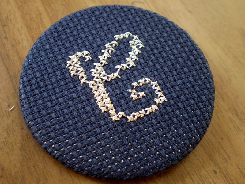 I'd heard the horror stories about working with metallic thread--"It tangles so easily!" "It's such a pain to work with!"--but I foolishly didn't believe them...until last week. A kind crafty friend generously lent me her button maker, and I decided to test it out and make a cross-stitch pinback button. Armed with blue aida cloth and silver floss, I set to work cross-stitching a c design that I'd found in a pattern pamphlet I picked up from Half Price Books. About two stitches in, problems started to occur. Strands separated, knots formed, and I missed stitches, which led to me pulling them out and starting again. Thankfully, my project was small (the button is 2 1/4" in diameter) and I finished it relatively quickly.