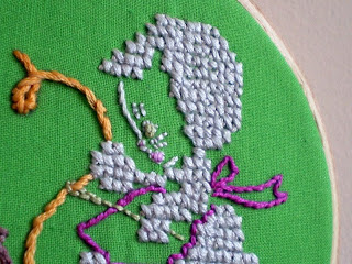 mini embroidery swap: what i received Posted by Caitlin Topham on April 27, 2010 So in exchange for the matryoshka cross-stitch I sent Adaiha, she stitched up this adorable crafty kitty for me, using this vintage transfer from doe-c-doe's Flickr stream. I love the little cross-stitch details, especially the little x's that form the pattern on the fabric spilling out of basket below. The back of the hoop is finished off beautifully with a piece of goldenrod floral fabric.