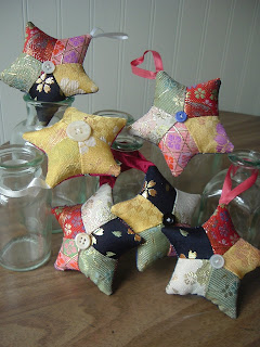 Sew Mama Sew's Scrap Buster Contest back in October), I made each star from remnants of Japanese fabric, scraps of ribbon, and buttons.