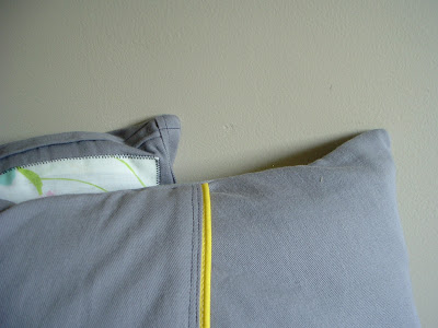 The gray backing of each pillow is actually from the tablecloths used at my August wedding. I added yellow piping to the back flaps to tie everything together.