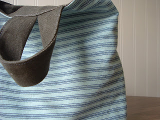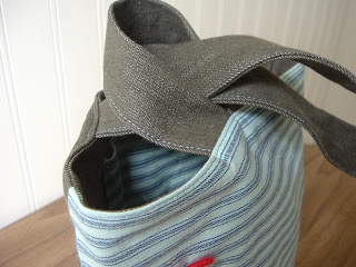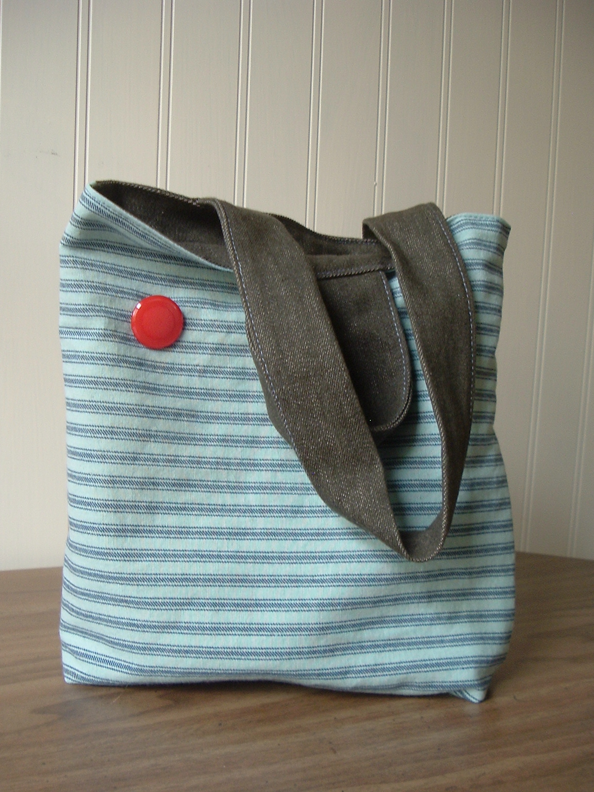 The interior and back of the bag are the same charcoal gray canvas-like material (a thrift store find) I used on the handles, and a small pocket, made of the blue ticking, is on the inside. I added a red plastic button (another thrift store find) to the outside of the tote.