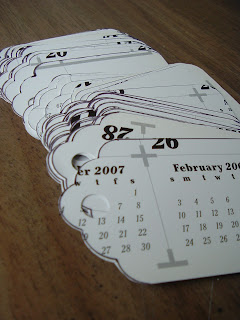 Using an old calendar featuring panoramic views of Big Sur, I got to work tracing an actual tag onto the back of each calendar image. I cut each tag out by hand, and using my trusty three-hole puncher, punched holes into the top of each one.