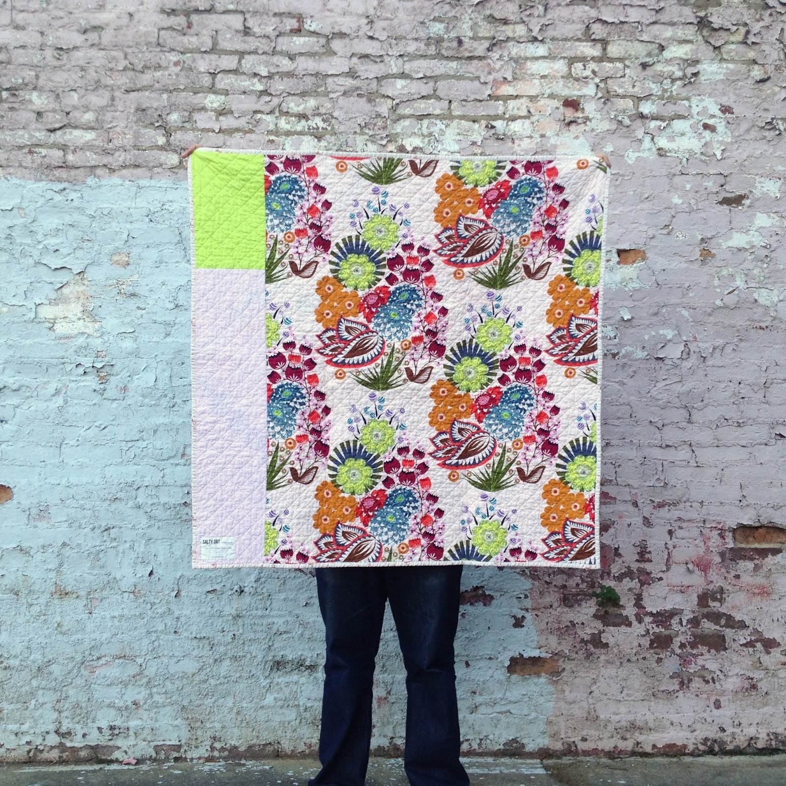I paired the Heather Bailey, Amy Butler, and Cloud9 prints in the quilt top with another Amy Butler print on the back.