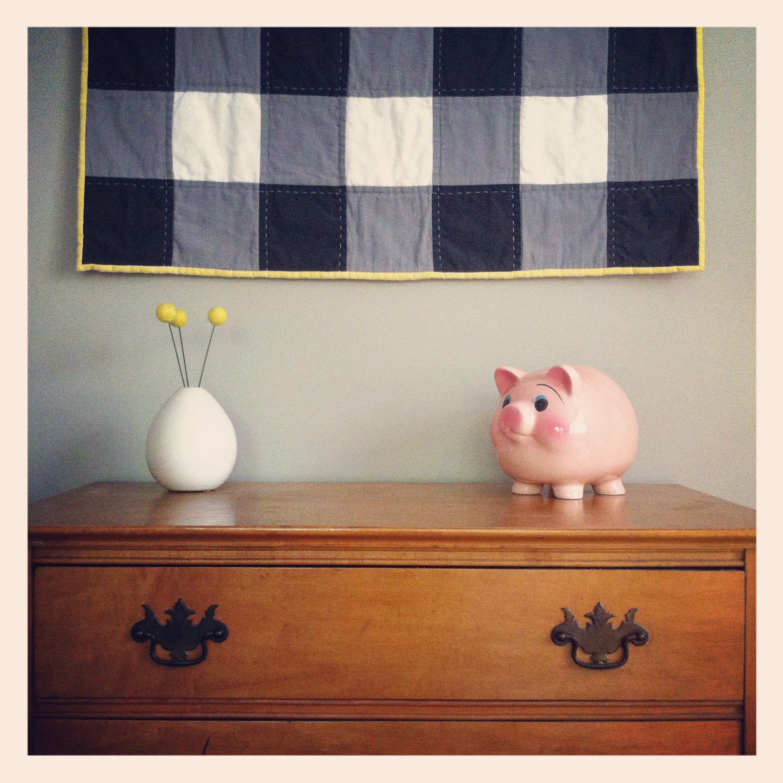 In an effort to make our bedroom look a bit more like adults live there, I decided it was time to update the pink piggy bank from my freshman year of college, which I have sitting on my dresser. One coat of gold spray paint later, I was done (and in love):