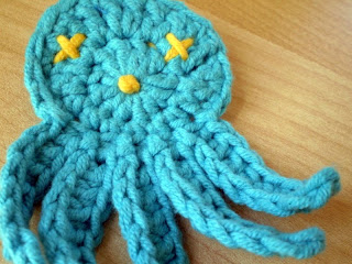 I used a combination of vintage turquoise and yellow gingham fabric for the buttons' backgrounds, and embroidered the six little owls in black floss. I initially spotted the adorable owl on this set of coasters, and eventually traced the pattern back to Pimp Stitch.