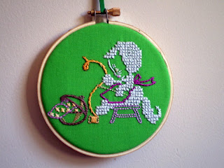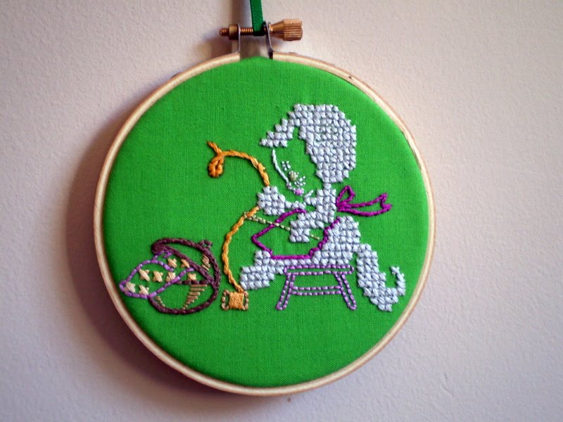 So in exchange for the matryoshka cross-stitch I sent Adaiha, she stitched up this adorable crafty kitty for me, using this vintage transfer from doe-c-doe's Flickr stream.