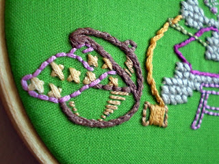 Inspired by my friend's living room, which is filled with yellow accents, I used gray embroidery floss and a vintage yellow napkin that my mom sent to me after cleaning out one of her linen drawers. I used a chain stitch for the entire piece.
