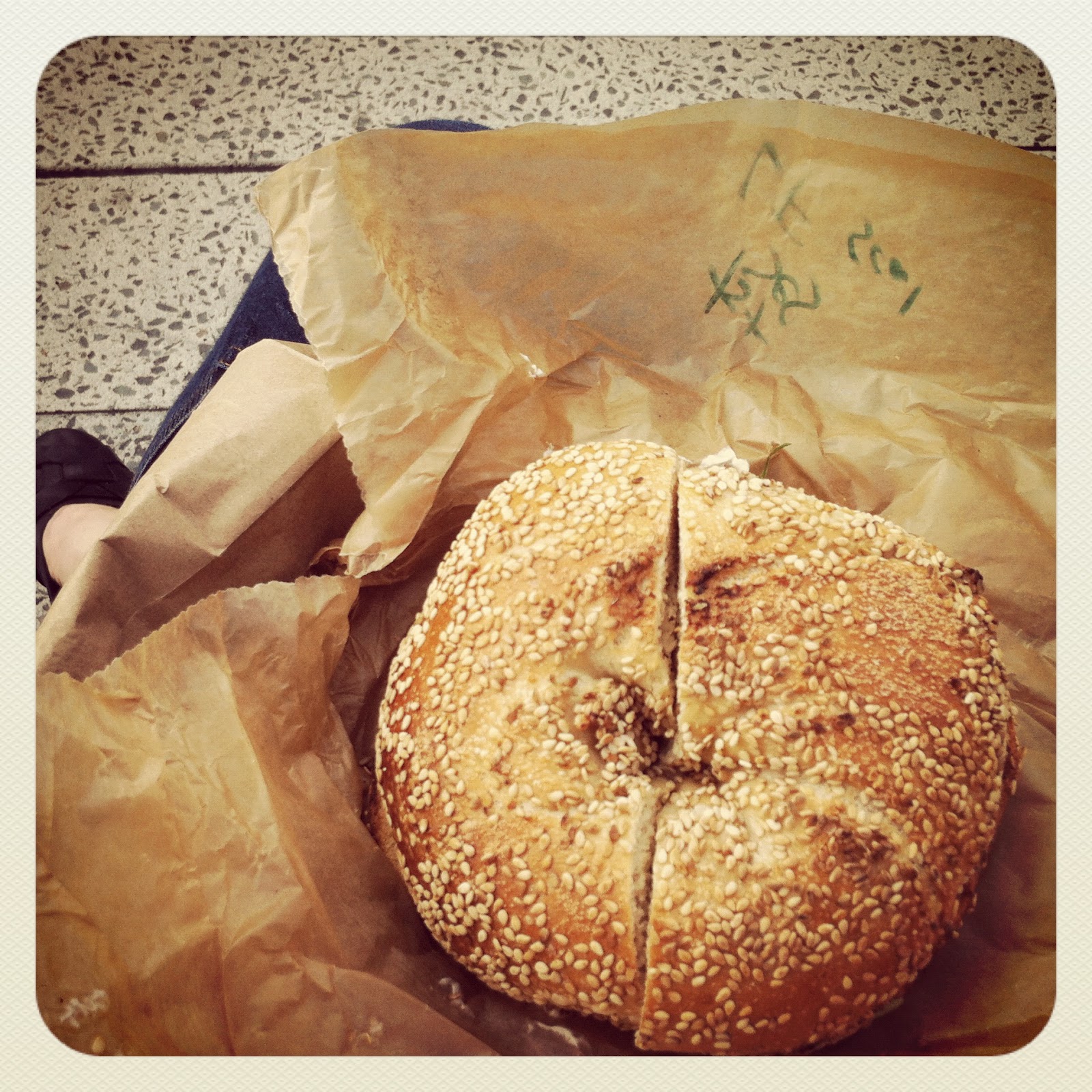 Huge sesame bagel from Brooklyn Bagel, devoured on a bench on The High Line, the perfect place to eat breakfast.