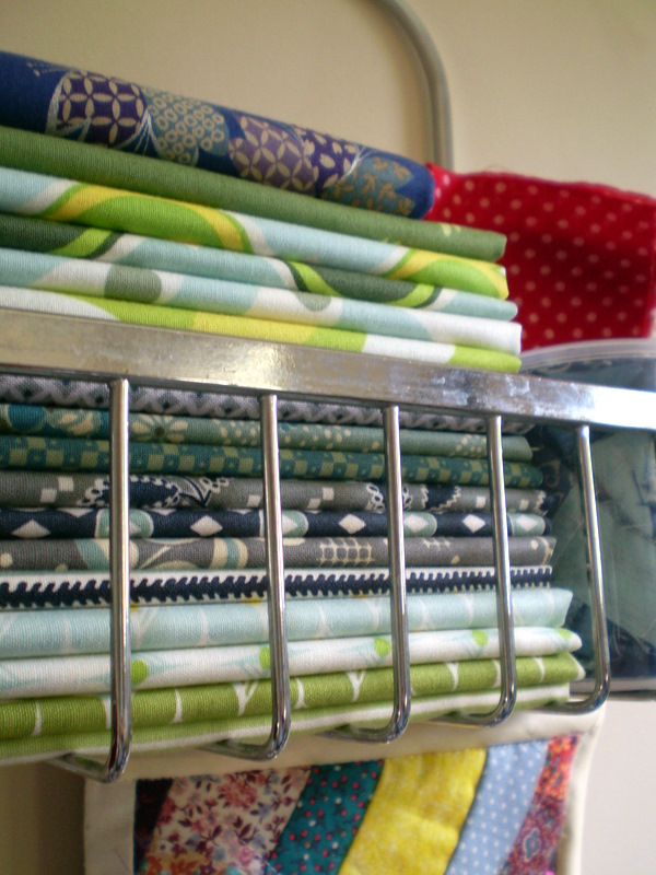 On the wall above my sewing machine, I've hung a shower caddy, which I've loaded up with pretty fat quarters and scraps of fabric.