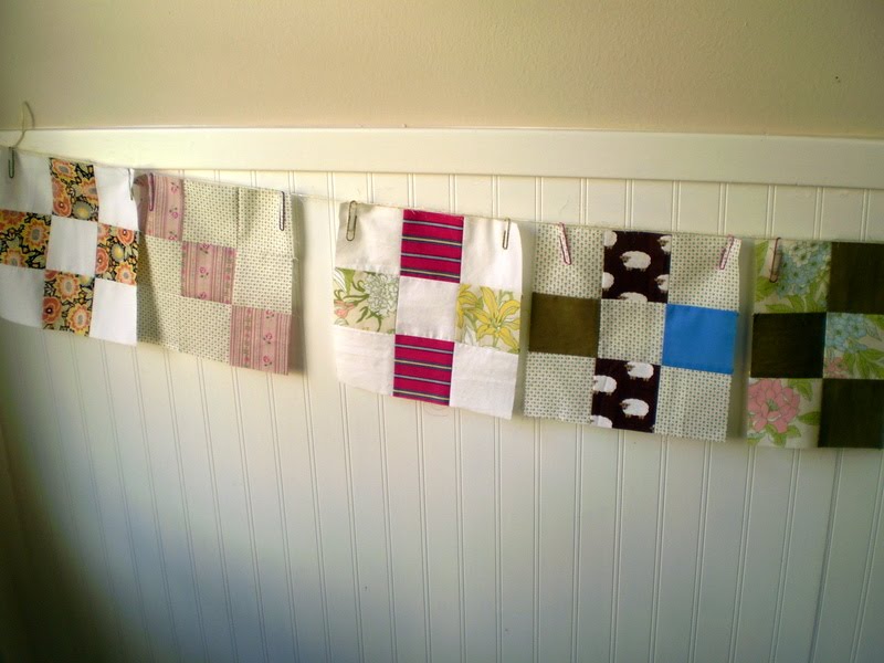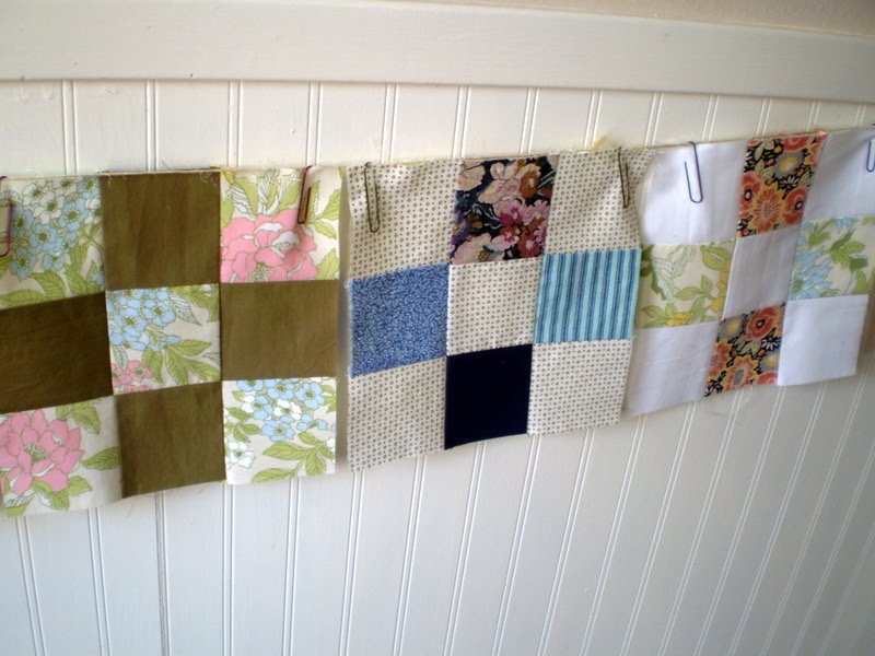 While the quilt is still in the beginning stages (I'll post pictures of it here when it's done!), I'm also working on a stack of blocks to donate as well, which are pictured here. Each nine-patch square is made from scraps I have in the studio, including vintage sheets and thrifted remnants.