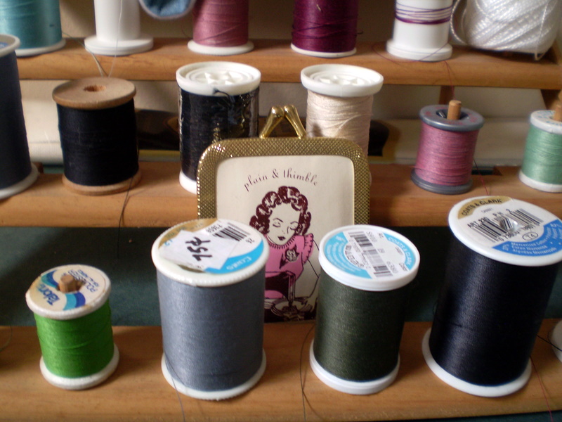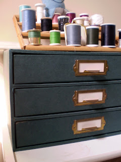On top of the drawers is a spool rack made by my great-grandfather, who also made dollhouse furniture, as well as a Plain & Thimble sewing kit given to me by a friend.