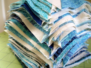 I cut and sewed my blocks together this week, after a lot of time going back and forth on color choices. In the end, I wound up using a cornflower blue solid with two organic Cloud9 prints that I picked up at Nido in Burlington, Vermont, and two green prints (from Amy Butler's Daisy Chain collection and Heather Bailey's Nicey Jane collection) from City Craft in Dallas, Texas. My question to you is, do you think this color palette works? I've been going back and forth on the greens. In some lights I totally think they work together, and in others, I'm less sure. Any thoughts or feedback--and alternate fabric suggestions--would be much appreciated!