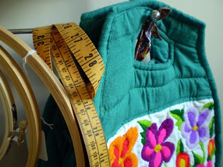 I also have embroidery hoops, a measuring tape, and a bag that I picked up at a market in San Antonio, which holds all of my knitting supplies, hanging from the caddy.