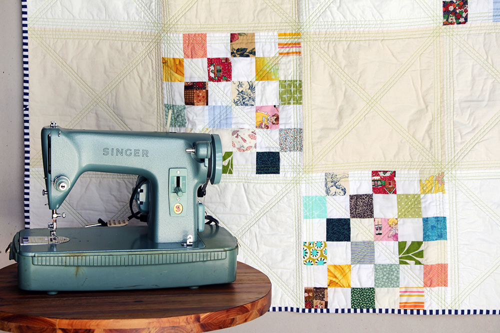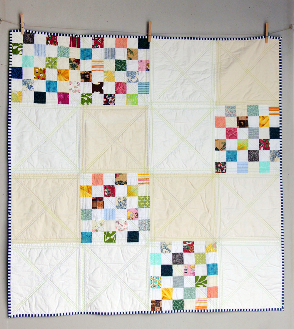 I pieced the back using largish scraps from my stash, and quilted it in light blue thread with a cross-hatch pattern. It's now for sale in the Etsy shop, if you'd like to take a look. (Update: This quilt has now sold. Thank you!)