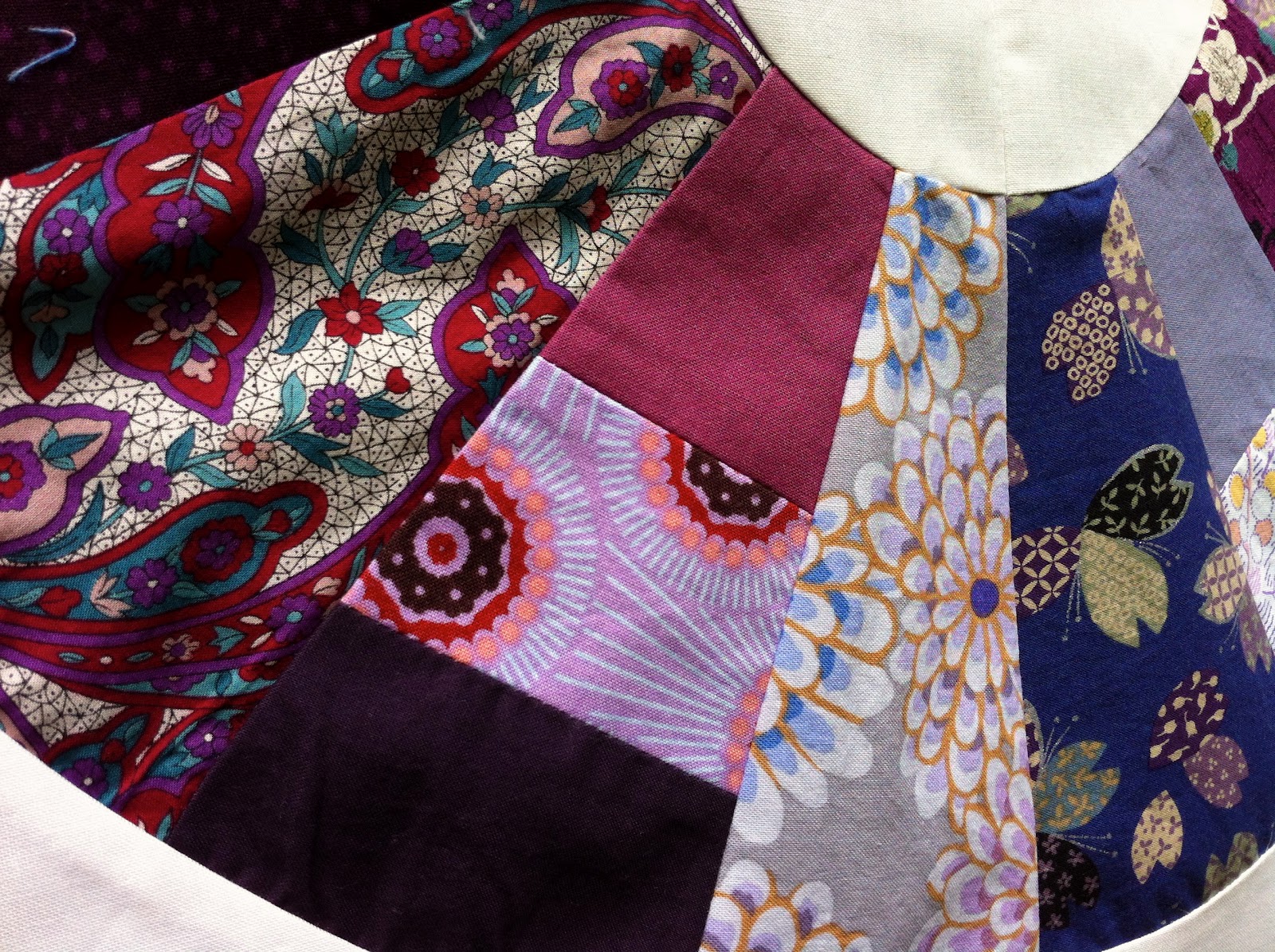 Though the piecing is not perfect (there was definitely some bubbling due to all of the bias-cut edges stretching), I love the results and am particularly smitten with the purple---I'm surprised at how well all of those scraps work with one another. I can't wait to quilt it and turn it into a wall hanging!