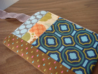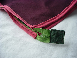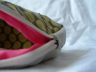 I used gray and green Amy Butler fabric on the inside and for the exterior strips, and used pink binding tape to hide the zipper's edges.